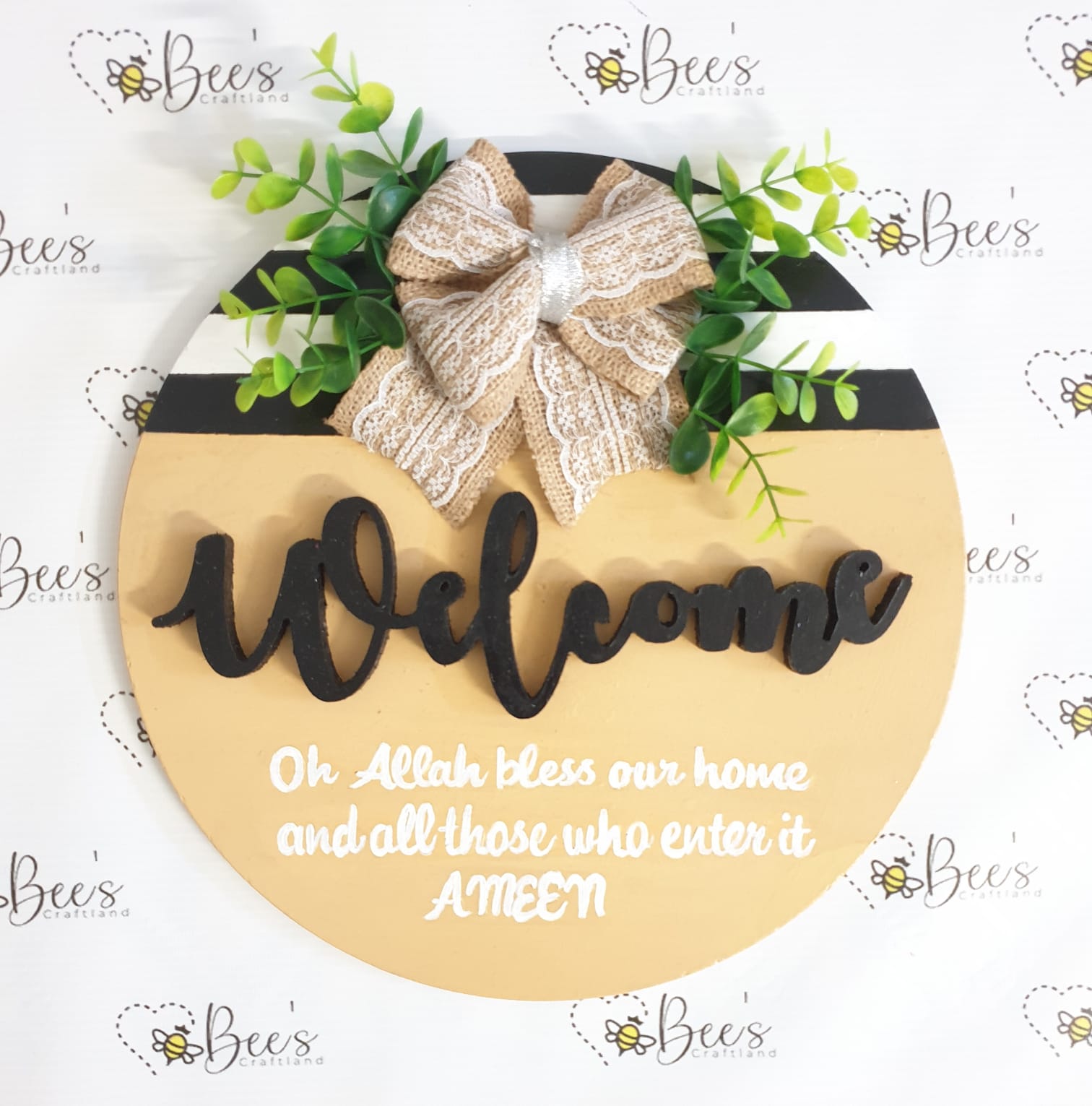 Dua Welcome Sign (I) is a beautifully handcrafted MDF wall décor designed to add warmth and blessings to your home entrance. Featuring elegant Islamic calligraphy with a welcoming message, this 14″ round sign is ideal for doors, hallways, and entry walls. A perfect blend of faith, style, and handmade charm for modern homes.
